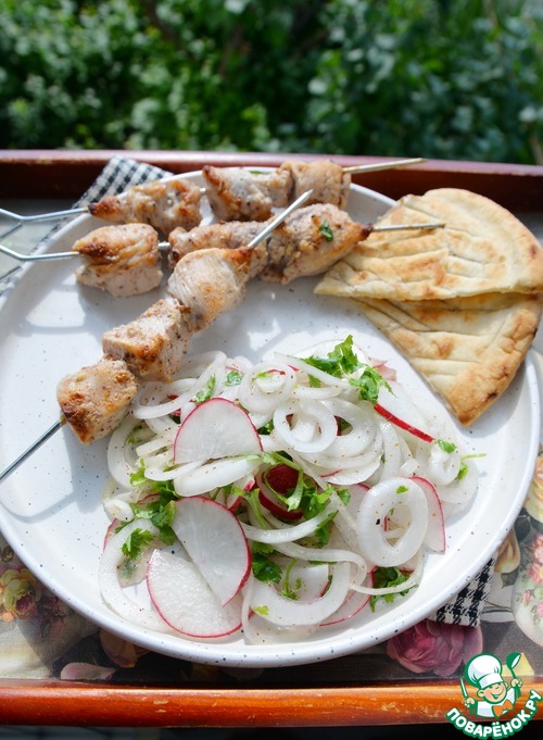 На пикник к нашему любимому шашлыку предлагаю приготовить салат. Это свежий, ароматный, хрустящий салат из маринованного лука, редиса и зелени.