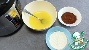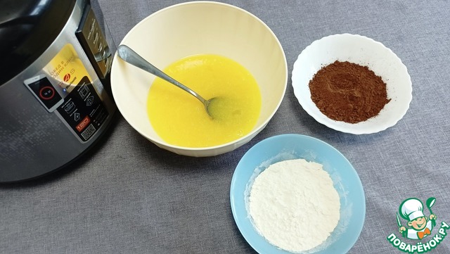 Продолжаем готовить тесто: добавляем муку и какао — до однородного состояния. Перемешивая ложкой или венчиком.