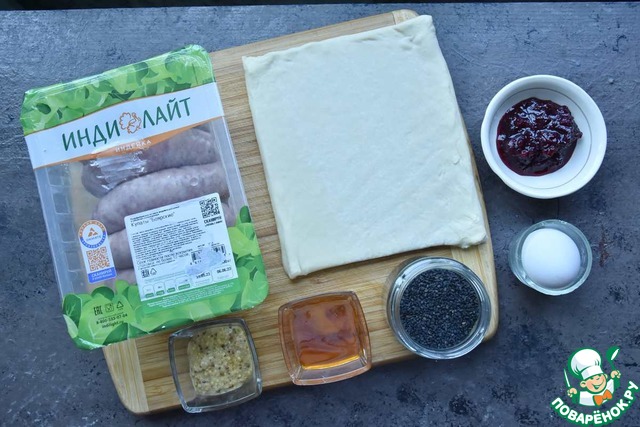 Для приготовления перекусочного венка с купатами готовлю продукты. Слоеное тесто использую бездрожжевое. Если вы не любите сочетание мясного вкуса с сладким ягодным соусом можете заменить его кетчупом или горчицей.