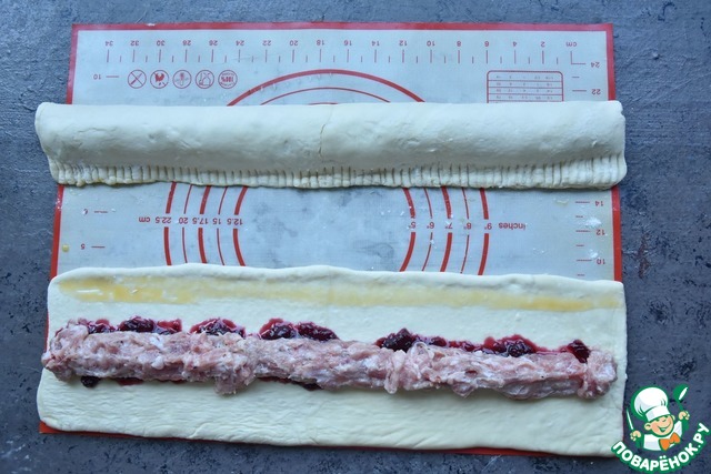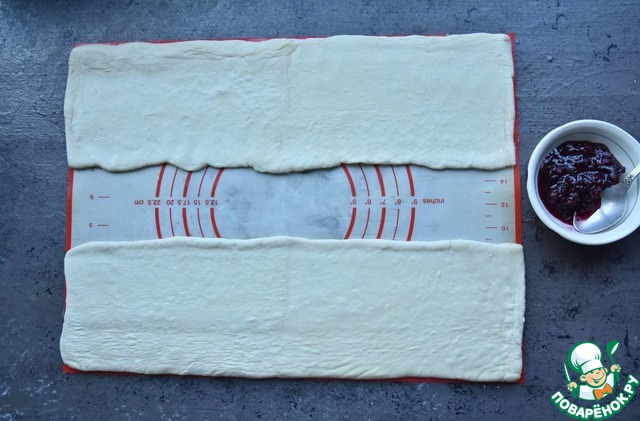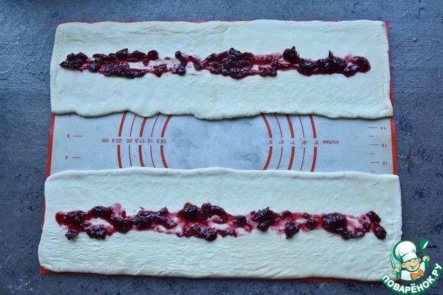 Смазываю середину полос из теста клюквенным соусом.