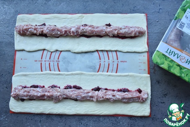 Освобождаю купаты от оболочки и распределяю фарш по всей длине теста.