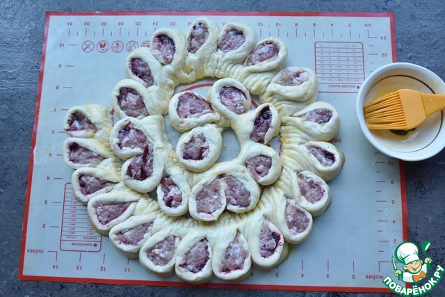 Смазываю готовый колбасный венок остатками желтка с помощью силиконовой кисточки.