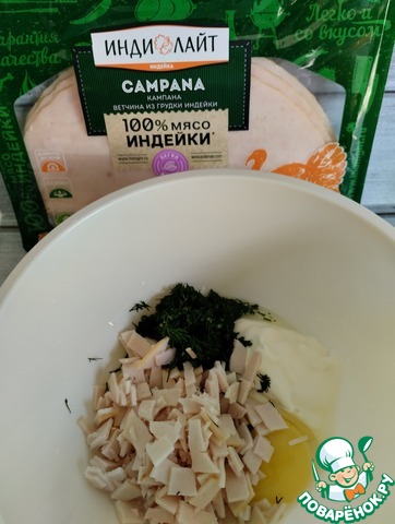 Ветчину нарезаем небольшими кубиками, укроп мелко режем и смешиваем со сметаной, яйцом и солью. Это будет начинка закуски.