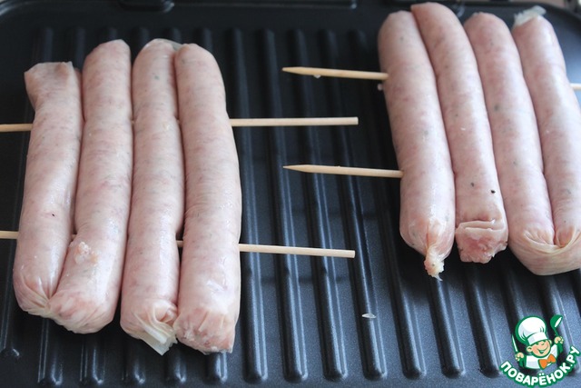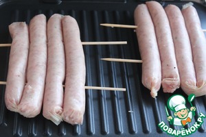 Нанизать сосиски по 4 штуки на две шпажки.