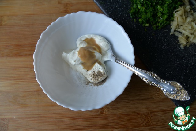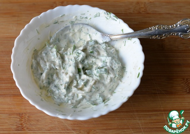 Кладём в заправку маринованный огурец, зелень, всё перемешиваем.