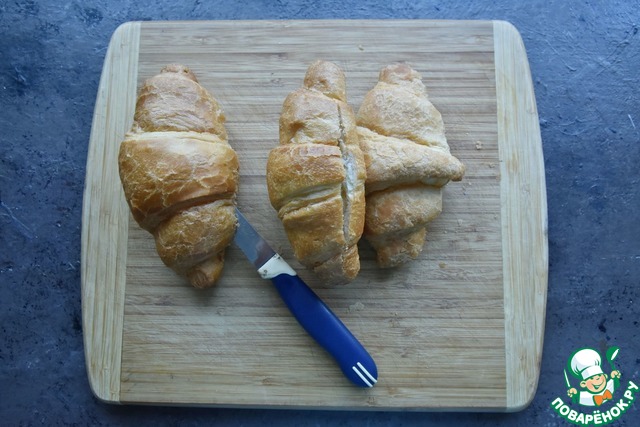 Разрезаю каждый круасан по длине, но не до конца. Достаточно, чтобы сформировался глубокий кармашек.