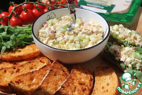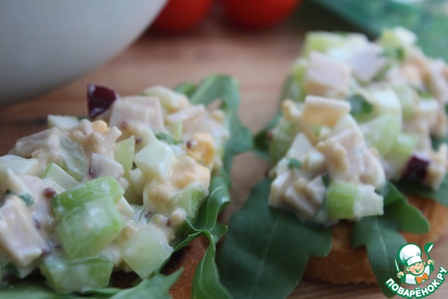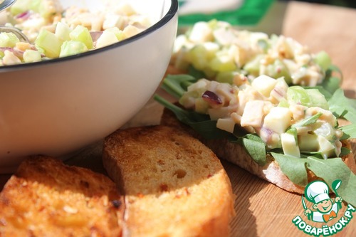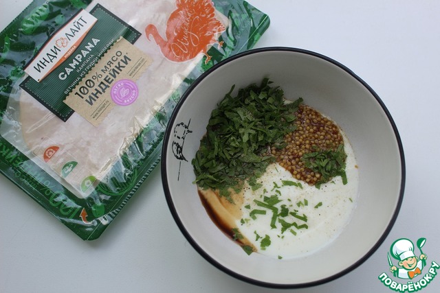 Нежная ветчина из индейки, освежающие овощи и легкая пикантная, йогуртовая заправка - этот салат хорош сам по себе, но еще лучше подать его на хрустящих тостах. Салат можно сделать заранее, а на природе лишь смешать с заправкой, тосты поджарить на гриле и можно наслаждаться!