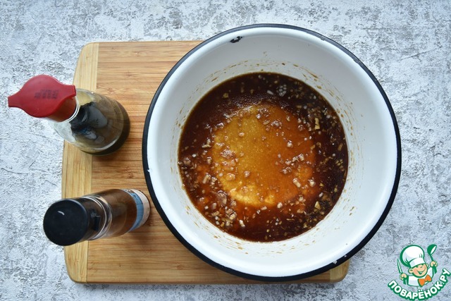 Для маринада смешиваю в емкости соевый соус, оливковое и кунжутное масло, измельченный чеснок и имбирь.