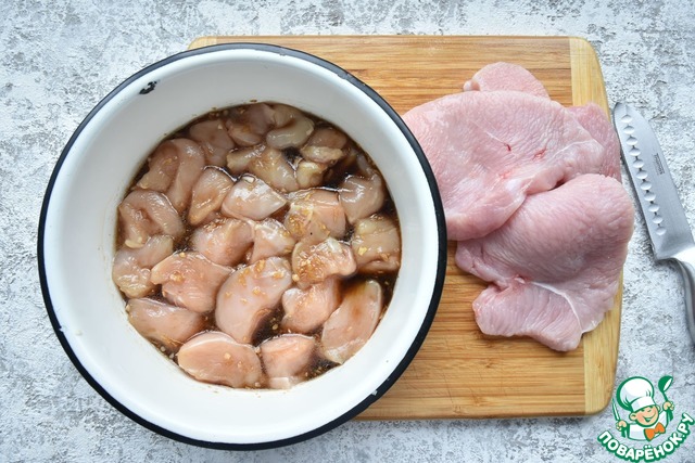 Нарезаю филе индейки на кусочки среднего размера и помещаю в посуду с маринадом. Накрываю емкость пищевой пленкой и ставлю в холодильник мариноваться на час. На свой вкус можете добавить соль и молотый перец.