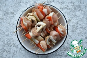 Так как я использую деревянные шпажки, предварительно замачиваю их в воде на час, чтобы при приготовлении на гриле они не горели. -