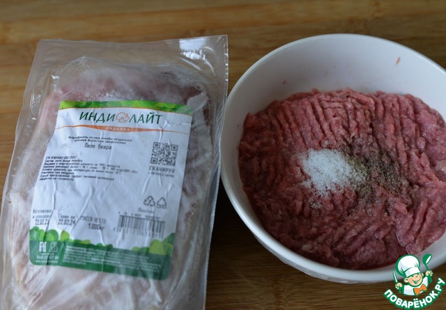 Берём индейку, у меня - филе бедра индейки "Индилайт". Перекручиваем в фарш, добавляем соль и молотый перец по вкусу. Перемешиваем. Слегка отбиваем.
