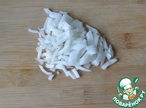 Готовим жюльен. Лук чистим, режем мелкими кубиками.