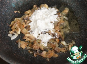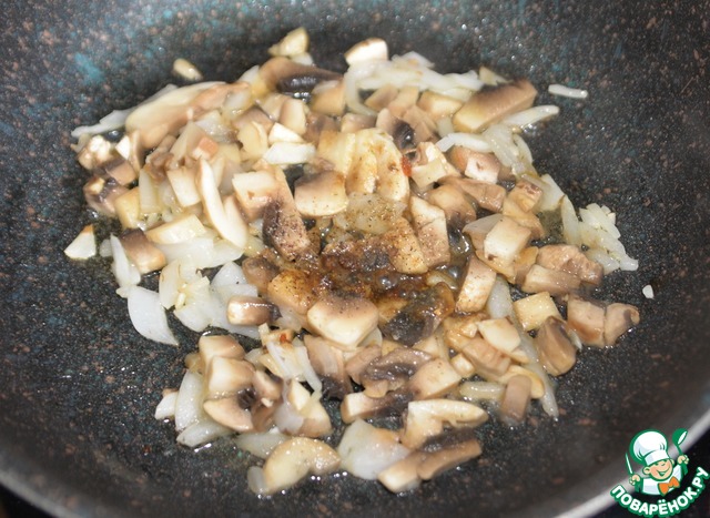 Кладём грибы к луку, обжариваем 10 минут на среднем огне до подрумянивания, помешивая. Кладём соль, перец.