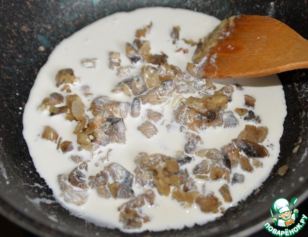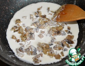 Добавляем сливки, перемешиваем, увариваем до загустения около 1 минуты на среднем огне.