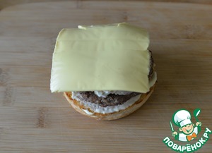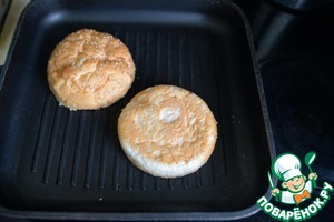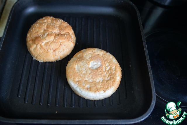 Булочку для бургера разрезаем вдоль посредине, подсушиваем на срезе на сковороде-гриль.
