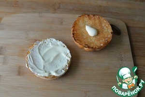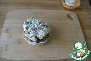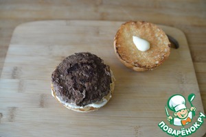 Верхнюю часть булочки смазываем кетчупом (поверх майонеза).