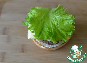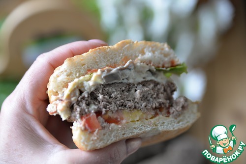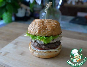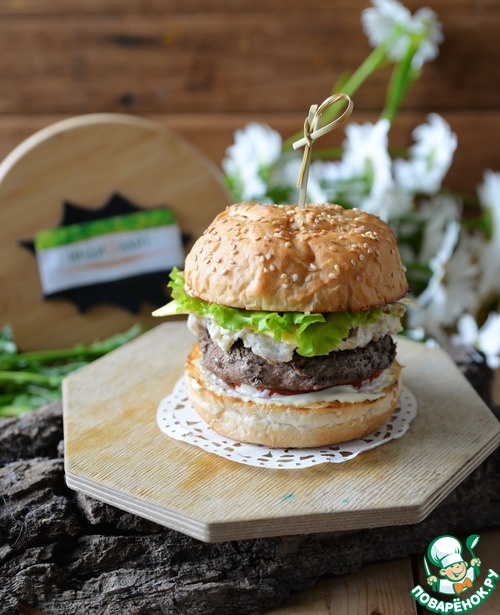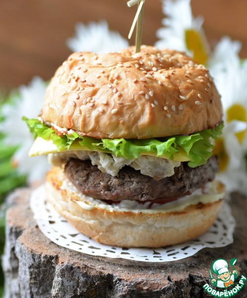 Накрываем бургер верхушкой булочки, слегка прижимаем, скрепляем шпажкой. Приятного аппетита!