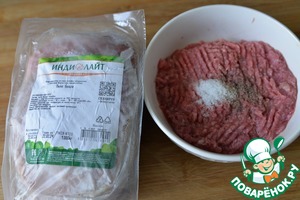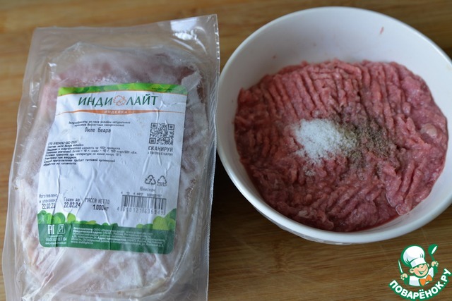 Берём индейку, у меня - филе бедра индейки "Индилайт". Перекручиваем в фарш, добавляем соль и молотый перец по вкусу. Перемешиваем. Слегка отбиваем.