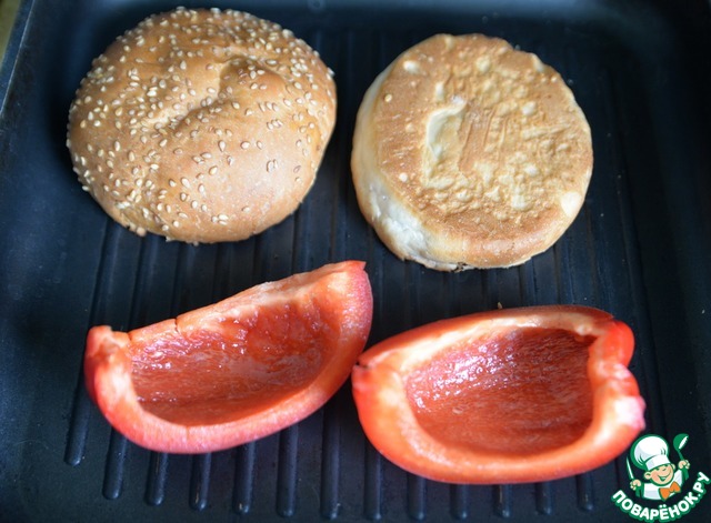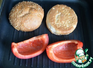 • Булочки для бургера разрезаем вдоль посредине, подсушиваем на срезе на сковороде-гриль. Болгарский перец моем, обсушиваем, режем широкими полосками, смазываем маслом, кладём на сковороду-гриль.