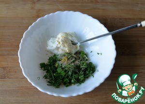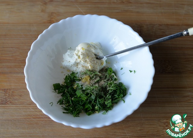 Смешиваем в миске творожный сыр, сметану, рубленную зелень, сок лимона, лимонную цедру, соль, белый перец. Всё перемешиваем.