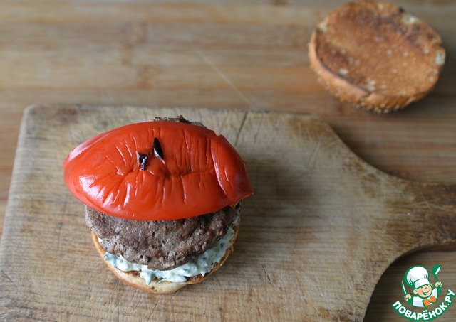 Сколько бы ни говорилось о вреде фастфуда, душа всё равно просит какой-нибудь бургер, да посочнее. А потому, если уж есть такое желание, то лучше сделать его самому. Такой бургер будет и вкуснее, и полезнее. Предлагаю сочный бургер из индейки с запечённым перцем и соусом из творожного сыра и зелени.