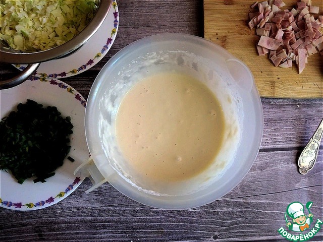 Капусту шинкуем тоже очень мелко. Помещаем в дуршлаг и обливаем кипятком. Даём жидкости стечь. Капуста станет мягкой и объём её уменьшится почти вдвое. Бекон тоже нарезаем мелко. Всё для припёка готово.