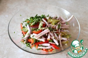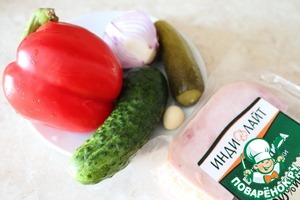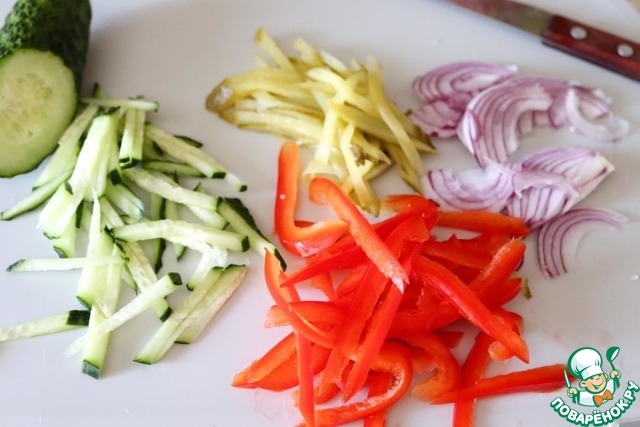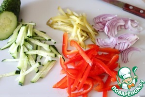 Соломкой нарезать свежий и маринованный огурцы, сладкий перец. Лук нарезать перьями.