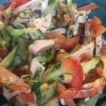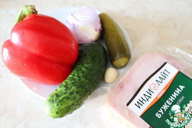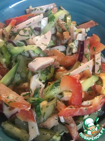 Приятный лёгкий овощной салат с бужениной из индейки. На пикник его можно взять в контейнере и заправить там же, перед подачей на стол.