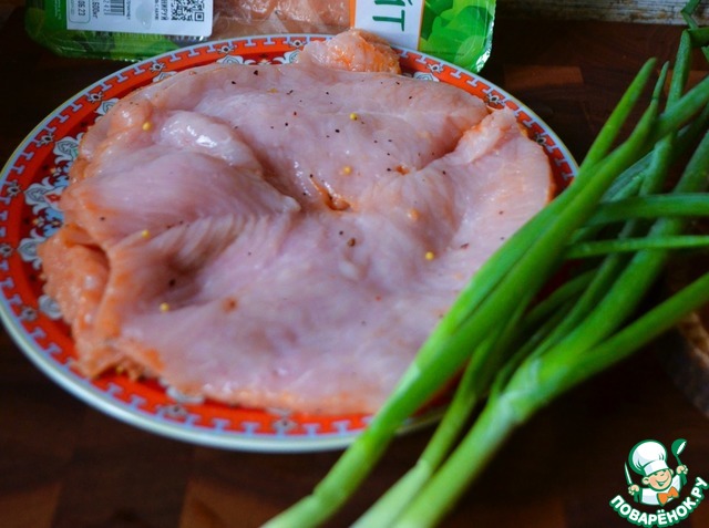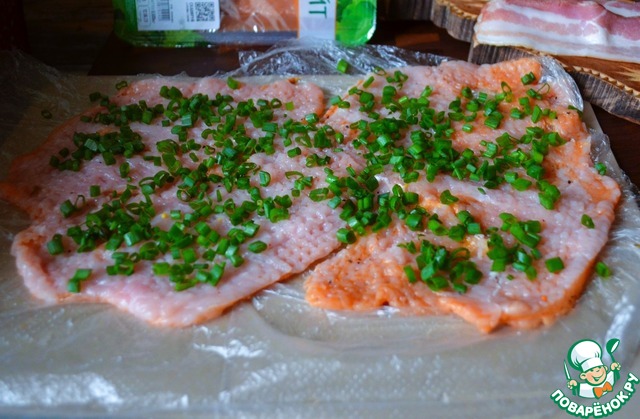 Соединить пласты, образуя прямоугольник, посыпать рубленым зелёным луком.