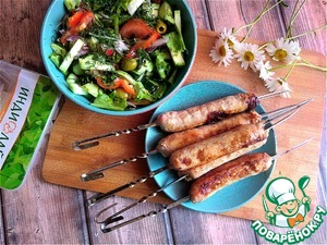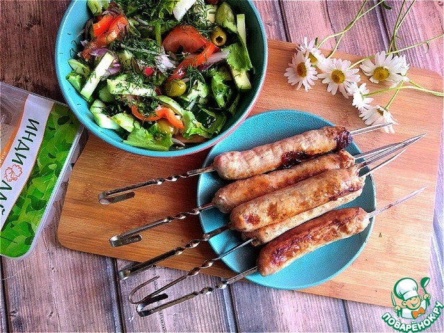 Я купаты сниму со шпажек. Их можно порезать на небольшие кусочки, подать каждому вилочки.