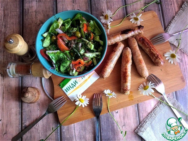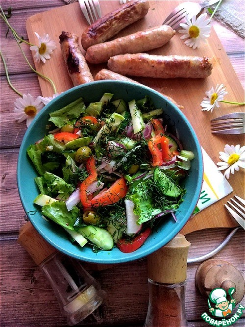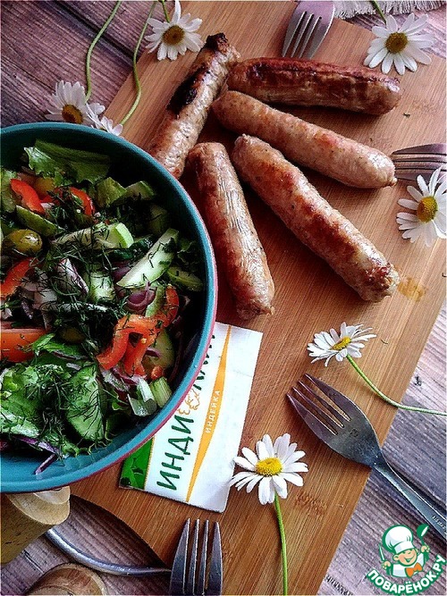Заправляем салат, присыплем любой зеленью и сразу же подаём, чтобы листики салата остались хрустящими. Салат нужно заправить перед подачей! Купаты тоже "поспели".