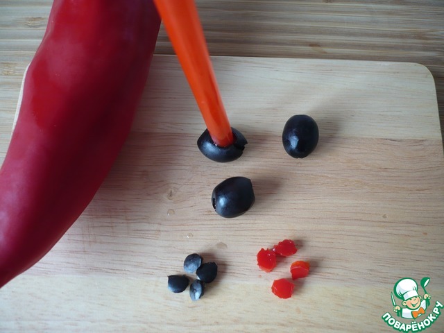 Из черных оливок или красного перца с помощью трубочки для сока вырежьте небольшие "капельки"для украшения сэндвича.