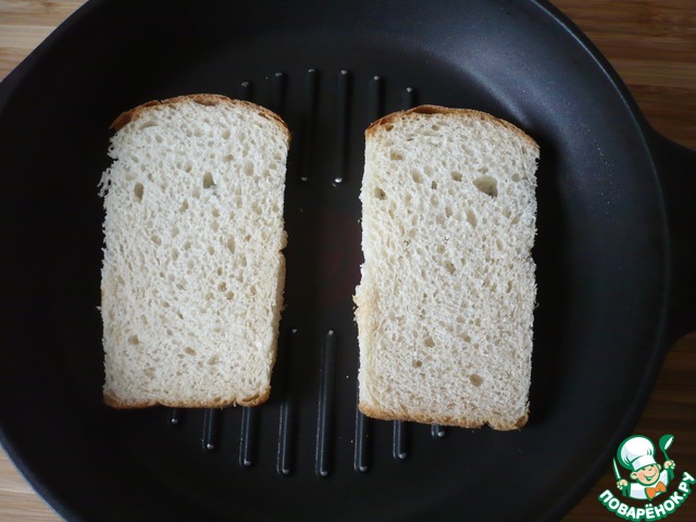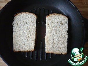 Затем на сковороде-гриль подсушите ломтики хлеба.