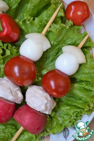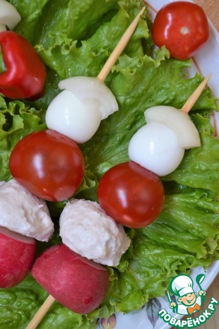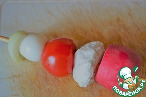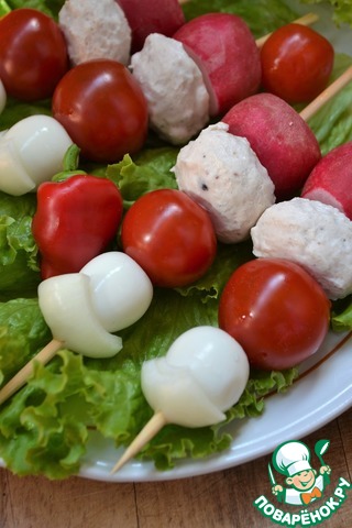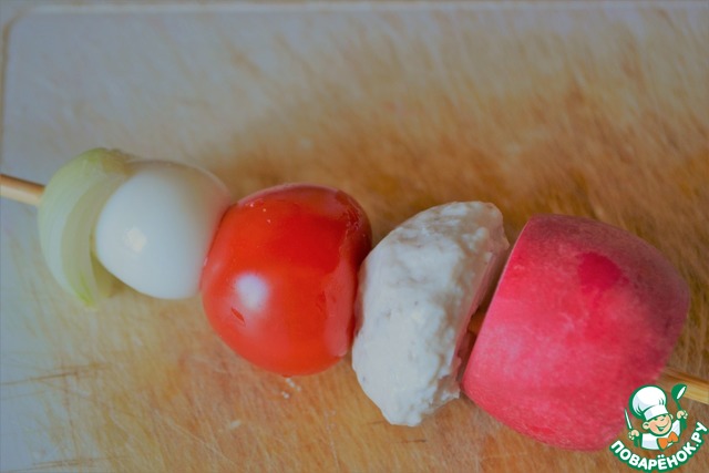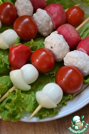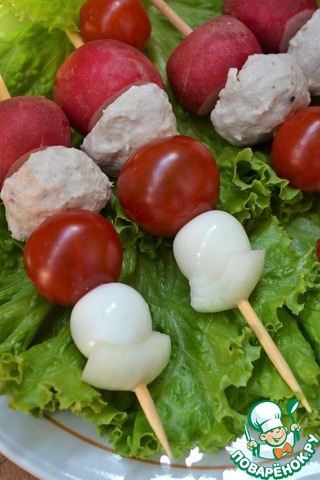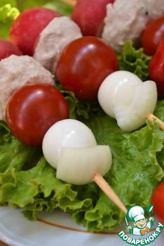 На деревянные шпажки нанизать редис, фрикадельку, черри, яйцо, а сверху лук.