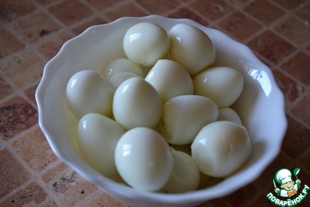 Перепелиные яйца отварить вкрутую: положить промытые яйца в кипящую воду и варить 5 минут. Затем сразу поставить под холодную воду. Очистить.