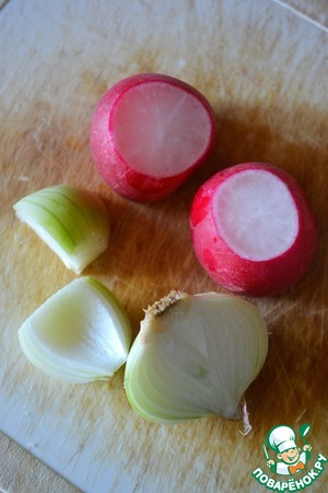 У редиса срезать верх и низ. Репчатый лук нарезать на четвертинки - понадобится только "крышечка"