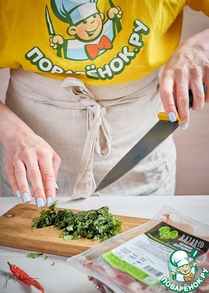• Мелко нарезать свежую мяту и кинзу. В идеале свежую с грядки, но у меня пока только замороженная.
