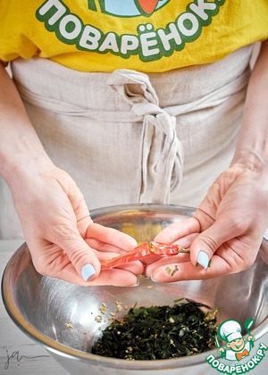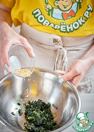 • Добавить гранулированный чеснок, соль и растереть травы до выделения сока.