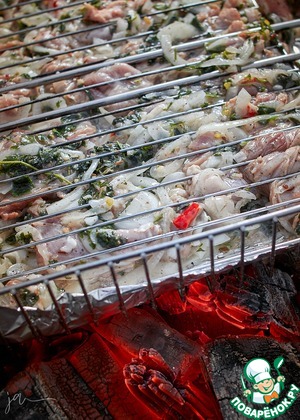 • Далее, в зависимости от размера кусочков можно нанизать мясо на шампуры или, как я, выложить на решетку (с фольгой или без).