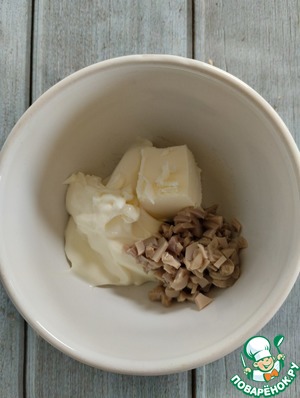 Грибы обтираем бумажным полотенцем для удаления лишней жидкости и нарезаем очень мелко. Добавляем их к сыру и маслу. Тщательно перемешиваем.