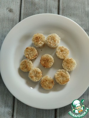 Хлеб нарезаем толщиной примерно 1 см. Выдавливаем из него кружочки (какой будет диаметр решать Вам). Подсушиваем на сухой сковороде по 1 минуте с каждой стороны.