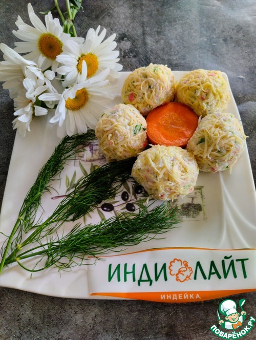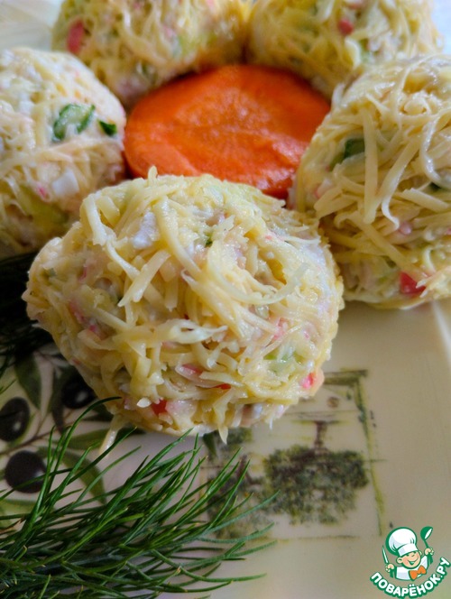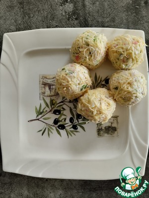 Твердый сыр трем на мелкой терке. Из ветчинно-крабовой массы катаем шарики и обваливаем их в сыре. Украшение закуски по Вашему усмотрению.