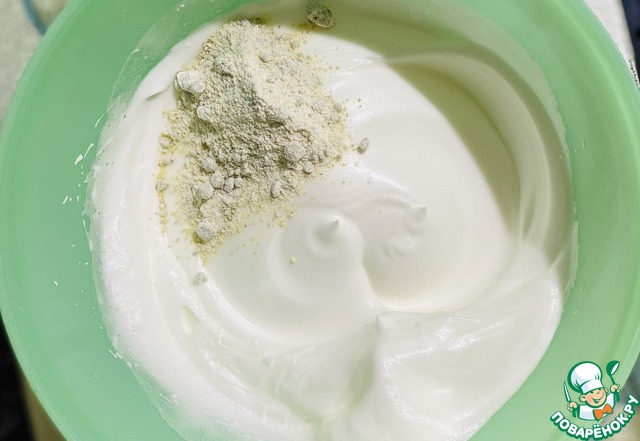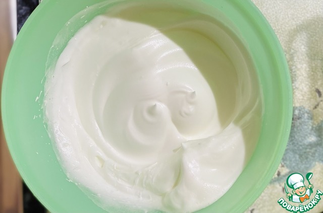 Белки взбить с сахаром до устойчивых пиков, желтки убираем в холодильник, можно использовать для других рецептов