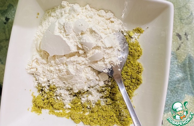 Муку пшеничную перемешать с фисташковой мукой, добавить ванильный Сахар, разрыхлитель теста, щепотку соли