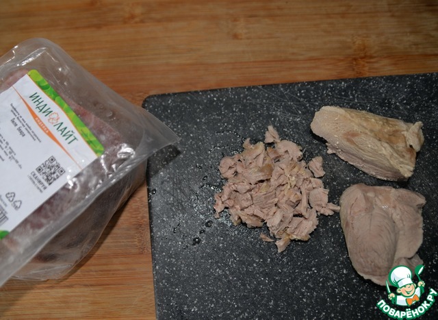 Достаём индейку из бульона, даём ей полностью остыть, режем небольшими кубиками.