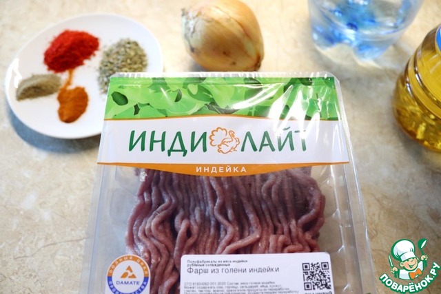 Подготовить ингредиенты для плескавицы. Плескавица обычно готовится из смешанного фарша (свинина-говядина), но индюшачий фарш ничуть не хуже. Я взяла фарш ТМ Индилайт.