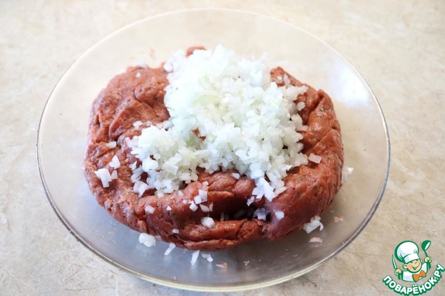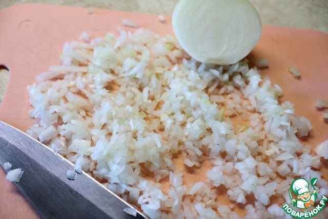 На следующий день достать фарш и дать согреться до комнатной температуры. Для плескавицы нужно много лука. Его мелко нарезать.
