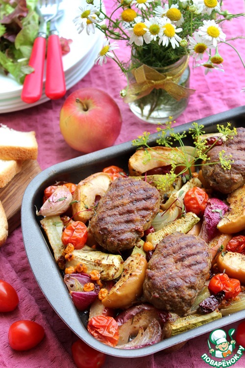 Вынуть форму для запекания с фруктово-овощным гарниром и люля-кебабами и подать на стол!