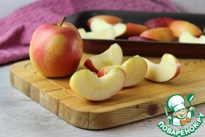 Яблоки помыть, обсушить, удалить семенную коробочку, нарезать на крупные дольки. Яблочные дольки хаотично выложить в форму для запекания.
