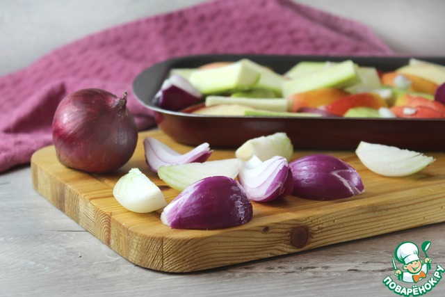 Репчатый и красный лук почистить, сполоснуть холодной водой, нарезать небольшими дольками. Дольки лука также хаотично выложить в форму для запекания к долькам яблок и брусочкам кабачка.